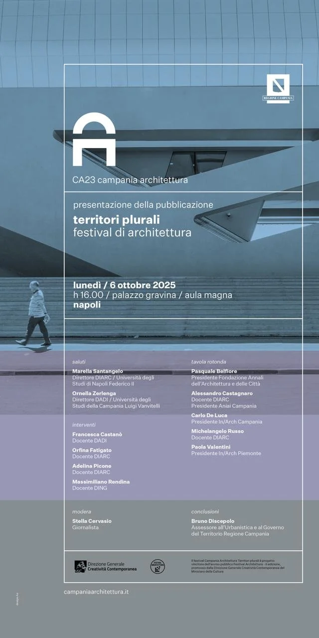 Lunedì 6 ottobre 2025 con inizio alle 16, presso l’Aula Magna del Dipartimento di Architettura (Palazzo Gravina_Via Monteoliveto, Napoli), si terrà il convegno di presentazione della pubblicazione territori plurali_festival di architettura, che illustra i risultati del progetto presentato dalla Regione Campania al Bando del MIC per un Festival dell’Architettura nel 2023.