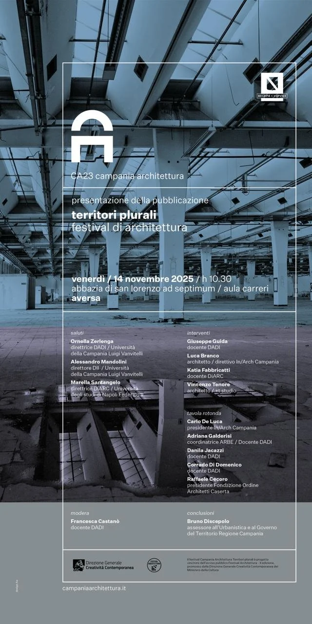 Venerdì 14 novembre 2025, con inizio alle 10 30, presso l’Abbazia di San Lorenzo ad Septimum, Aula Carreri di Aversa si terrà il convegno di presentazione della pubblicazione territori plurali_festival di architettura, che illustra i risultati del progetto presentato dalla Regione Campania al Bando del MIC per un Festival dell’Architettura nel 2023.
