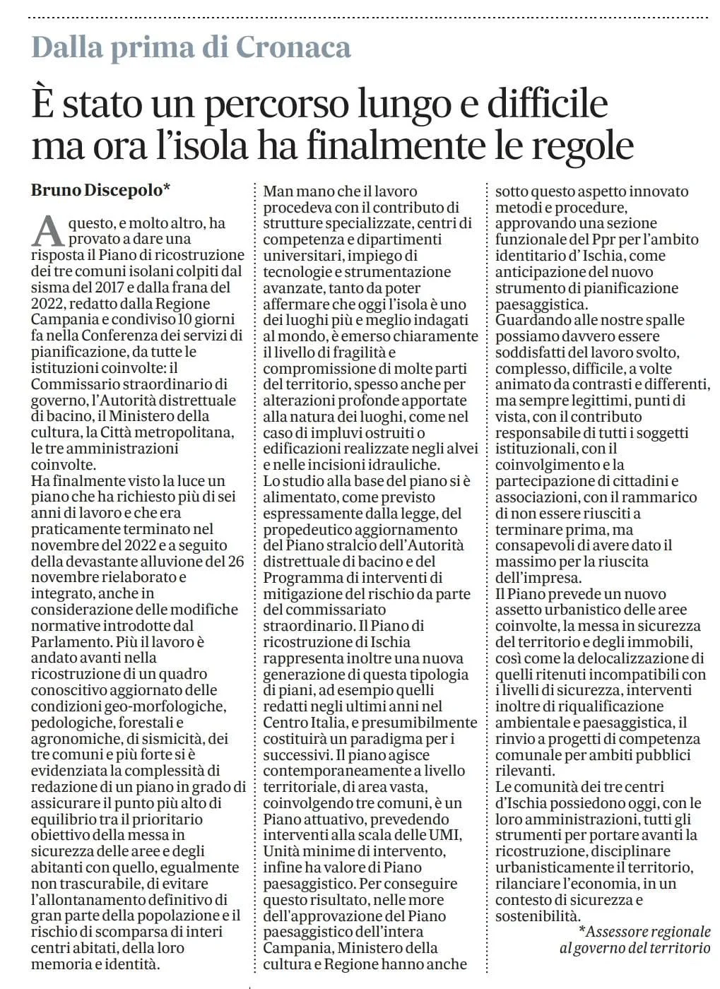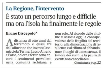 A distanza di 8 anni dal terremoto e quasi tre dall'alluvione che investì Casamicciola Terme, Lacco Ameno e Forio, dolore e ferite sono ancora i sentimenti prevalenti nella comunità ischitana, e non solo. Al ricordo delle vittime si associa oggi la consapevolezza della fragilità del territorio, alla dimostrazione di resilienza e al rifiuto ad abbandonare i luoghi di un'esistenza, il timore dei rischi e la paura di eventi non cancellabili. A questo, e molto altro, ha provato a dare una risposta il Piano di ricostruzione dei tre comuni isolani colpiti dal sisma del 2017 e dalla frana del 2022, redatto dalla Regione Campania e condiviso 10 giorni fa nella Conferenza dei servizi di pianificazione, da tutte le istituzioni coinvolte: il Commissario straordinario di governo, l'Autorità distrettuale di bacino, il Ministero della cultura, la Città metropolitana, le tre amministrazioni coinvolte.